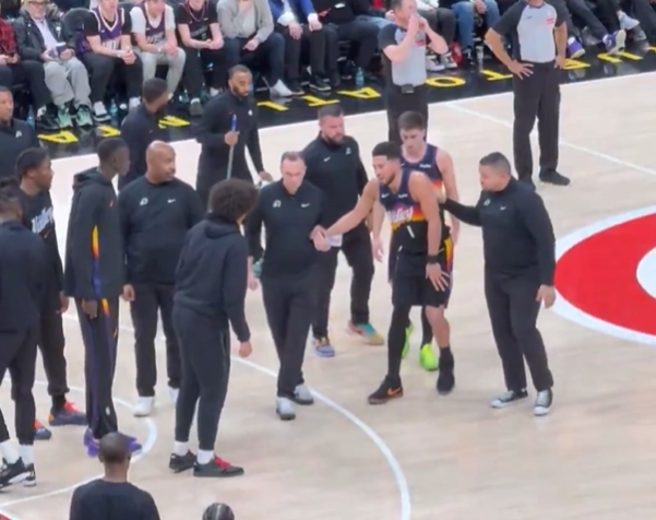 01月24日讯 太阳老鹰比赛第三节,布克右脚踝扭伤,已经被队友搀扶回了更衣室。